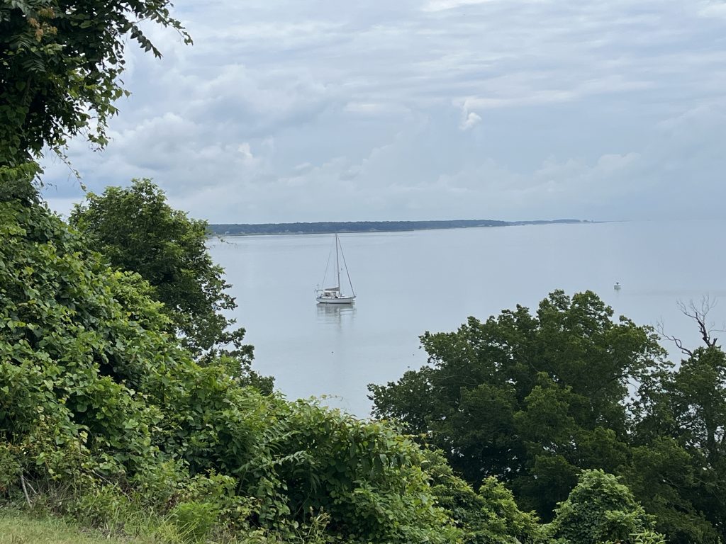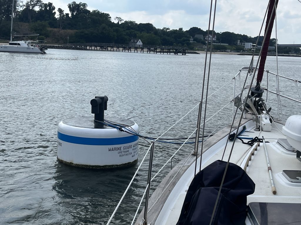Wednesday morning, we headed out with the water tank once again full and the pump working normally. We headed up the bay to Yorktown, some 40 miles away. The weather was clear and sunny, with the normal afternoon showers predicted. We made good time motoring and using the jib. Once there, we secured to one of the rather large free mooring floats. We waited until the following day to go ashore as we were tired and wanted to relax some.