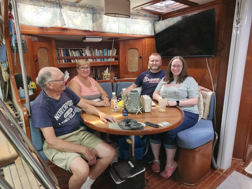 With most of the wedding celebrations over, on Sunday we had some time to show off our new to us boat. Bradley and Peggy stopped by with Peggy’s parents to check the boat out. This was also a good chance for Teresa and I to get to know Peggy’s parents a little better. We had an enjoyable time chatting and sharing stories. On Monday we return to Hampton for a night and then off to explore the Chesapeake.